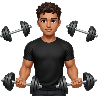 muscular 22 year old, Olive skin male, with short curly hair, with almond eyes, black T-shirt, lifting weights emoji
