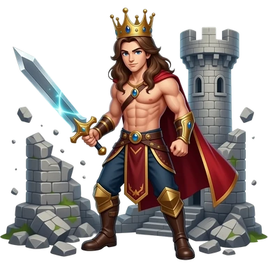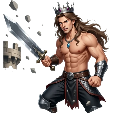 muscular shirtless twink king with extremely long brown hair destroying castle with sword emoji