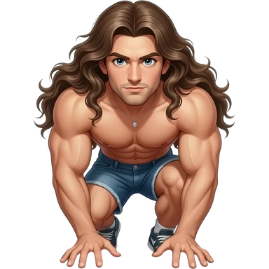 muscular shirtless twink with extremely long hair breaking ground emoji