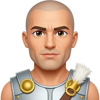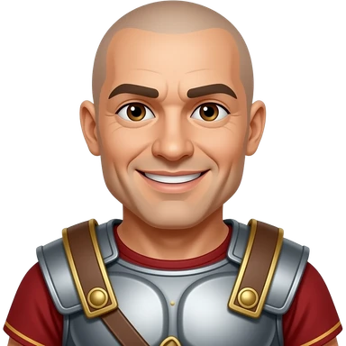 Muscular Roman soldier bald with brown eyes blowing a kiss the Letter E on the shield emoji