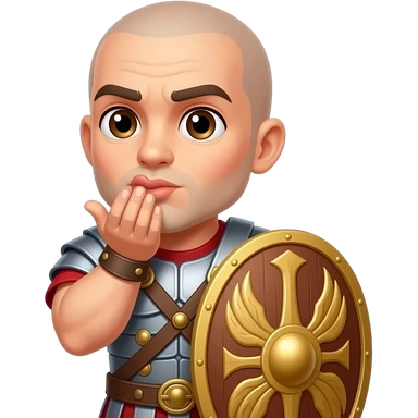 Muscular Roman soldier bald with brown eyes the Letter E on the shield kissing emoji