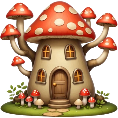 A whimsical style, mysterious yet very warm and beautiful mushroom house within tall skinny lush & bare trees emoji