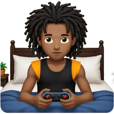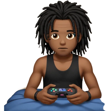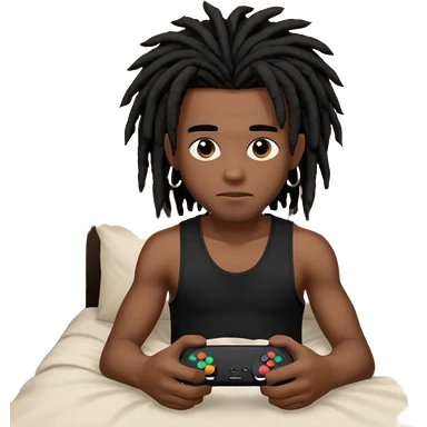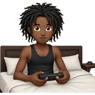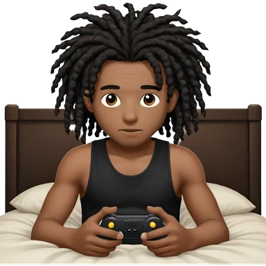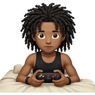 my black boyfriend in his bed with a black singlet on playing video games black dreadlocks emoji | AI Emoji Generator