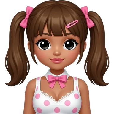 my melody hairclip, Doll faced shaped, hello kitty necklace, bimbo, black doll eyes, Big lips barbie, long dark brown skin with honey brown hair, bimbocore outfit light pink and black polkadots tank top with designed pink bow on it emoji