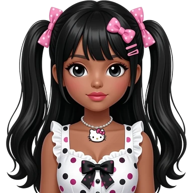 my melody hairclip, Doll faced shaped, hello kitty necklace, bimbo, black doll eyes, Big lips barbie, long dark brown skin with honey brown hair, bimbocore outfit emoji
