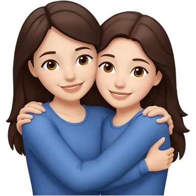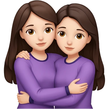 A brunette sister with green eyes and a brunette sister with green eyes in different clothes together hugging emoji