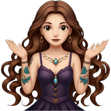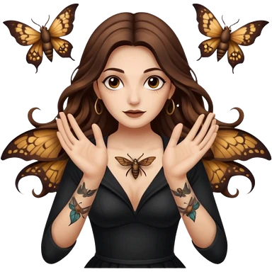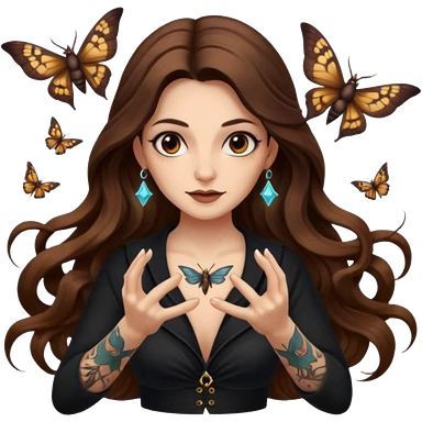 night witch woman long wavy brown hair tattoos spinning moth from fingers emoji