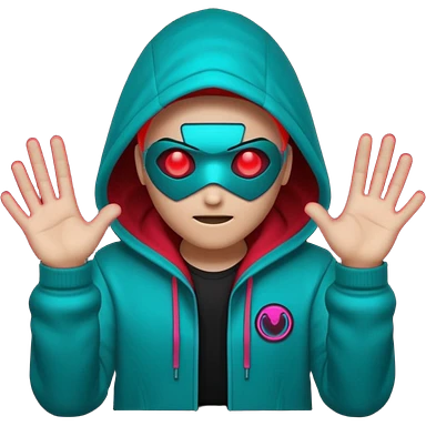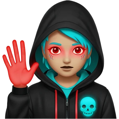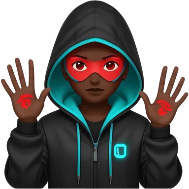 Neon cyberpunk hooded hacker emoji using the exact original palette: crimson red glow, cyan/teal highlights, black shadows. Character shakes head “no” and shows stop hand. Text “NO TO SCAMS” in red neon. Smooth looping animated sticker, transparent background, Discord emoji style. No new colors. emoji