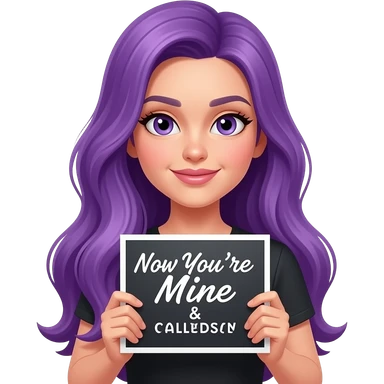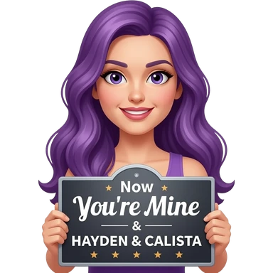 girl with long purple hair holding a Now you're mine HAYDEN & CALISTA sign emoji