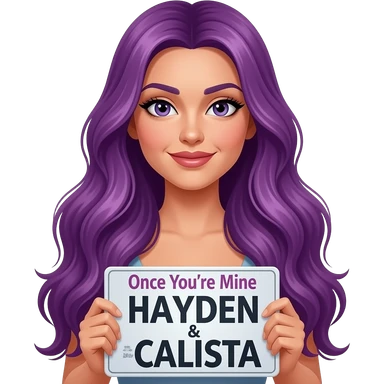 girl with long purple hair holding a Once you're mine HAYDEN & CALISTA sign emoji
