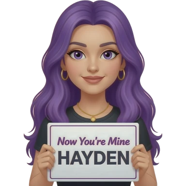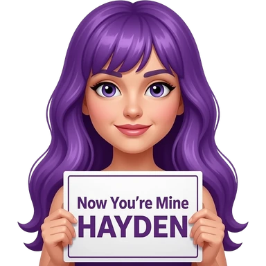 girl with long purple hair holding a Now you're mine HAYDEN sign emoji