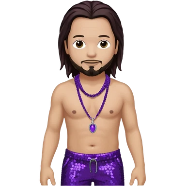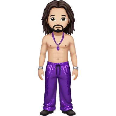 Jonathan Davis with purple sequin baggy pants, shirtless with necklace, long dark brown hair, light skin emoji