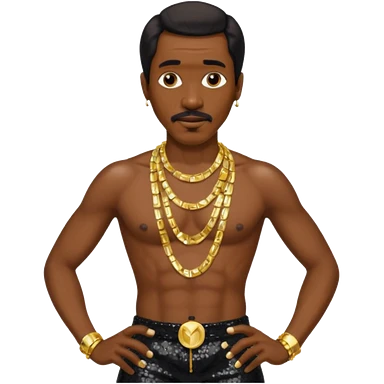 Dwayne Johnson with black sequin baggy pants, shirtless with necklace, dark brown hair emoji