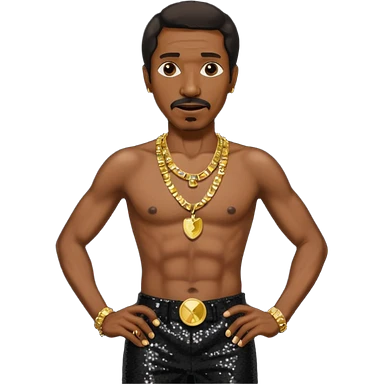 Ike Turner with black sequin baggy pants, shirtless with necklace emoji
