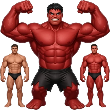 Massive very tall massively muscular red Hulk in black male bikini full body image realistic flexing biceps emoji