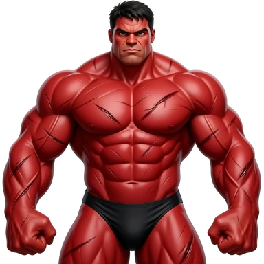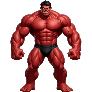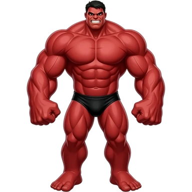 Massive very tall muscular red Hulk in black male bikini full body image realistic emoji