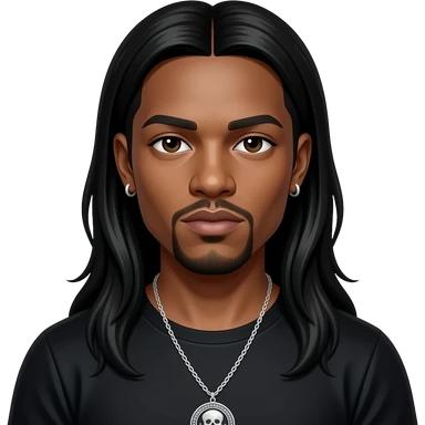 Flesh-n-Bone from Bone Thugs-n-Harmony with dark brown eyes, long black straight hair, black metallic t-shirt, necklace and earrings emoji