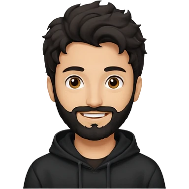 young fair skin pakistani guy smiling with black beard, wavy hair pushed back and brown eyes and thick eyebrows wearing black hoodie emoji
