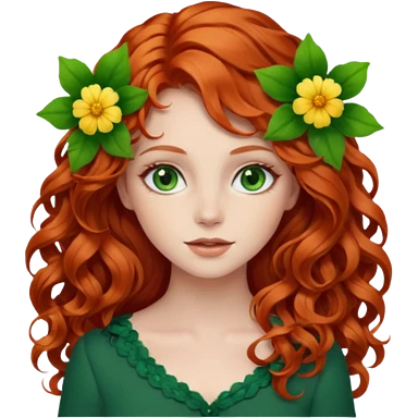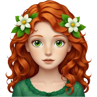 Natural redhead model, green eyes, wavy hair, flowers in hair emoji | AI Emoji Generator