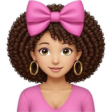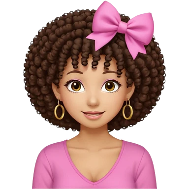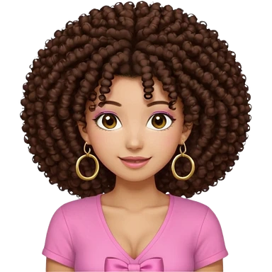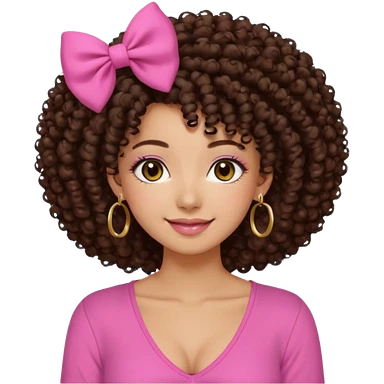 Naturally tan skin girl short darkBrown curly afropink shirt very long lashes hoop gold earrings Brown eyes gyaru smiling closed mouth cute bow hairclip small on the side. V neck pink shirt emoji