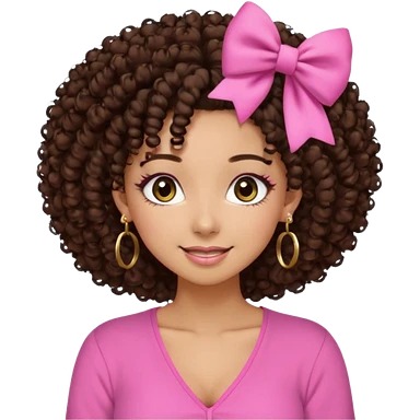 Naturally tan skin girl short darkBrown curly afropink shirt very long lashes hoop gold earrings Brown eyes gyaru smiling closed mouth cute bow hairclip small on the side. V neck pink shirt. Teenager emoji