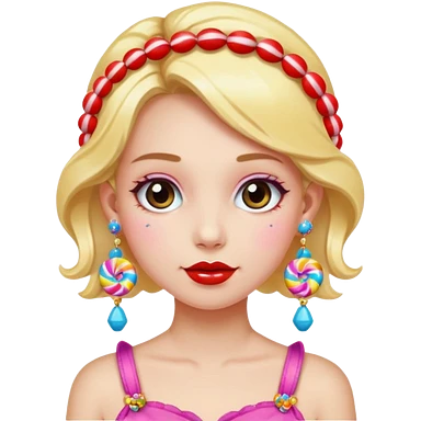 girl with a lot of accessories and earrings made out of candy emoji