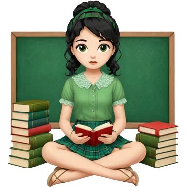 A beautiful girl wears a green lace blouse with short sleeves and a green lace skirt with a plaid pattern. Her long, curly black hair is styled in a messy bun. She holds books and crayons in her hands, and she is barefoot, sitting cross-legged on the floor. The illustration style is pop art. emoji
