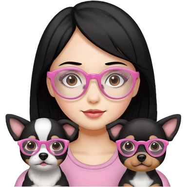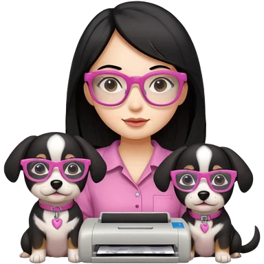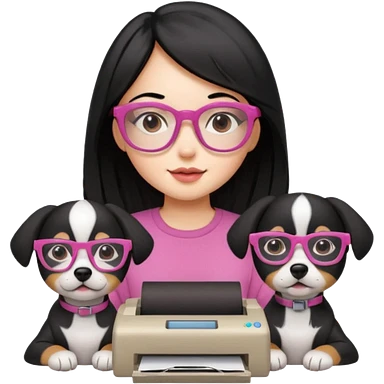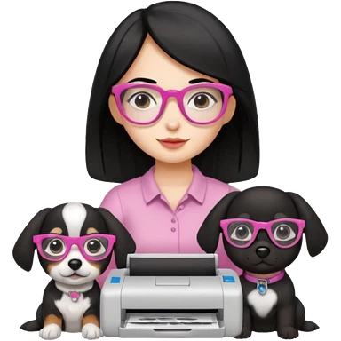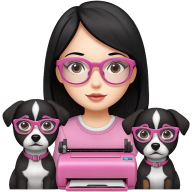 Necesito un logo de un emprendimiento que se llama pitu print dónde se trata de impresiones y cosas de papelería de una chica pelo negro con lentes rosados y una perrita café y otra perrita negro claro emoji | AI Emoji Generator