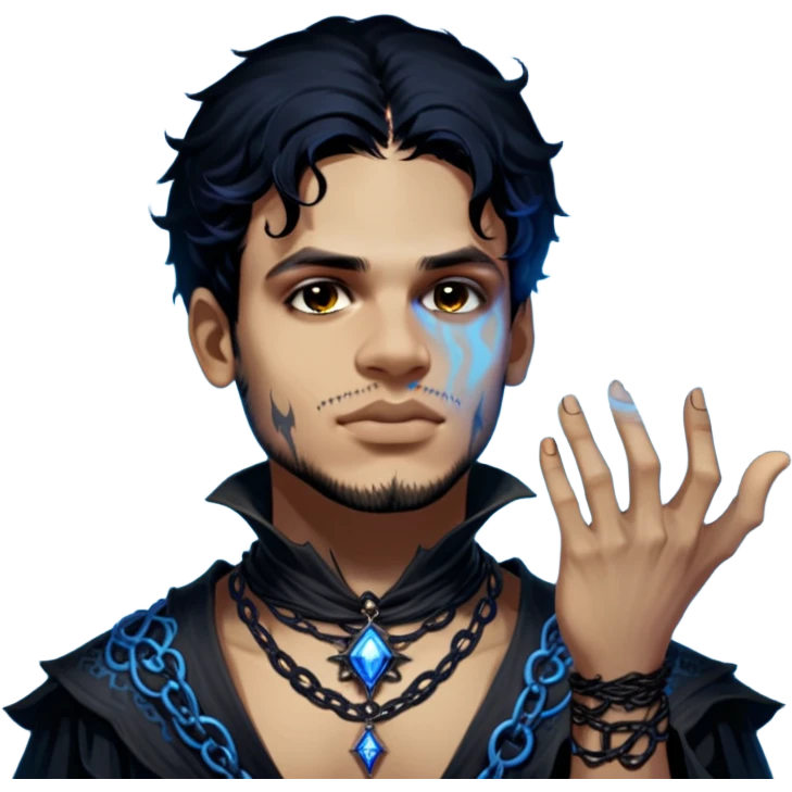 Necromancer man, black necromancer outfit with a skull necklace, with a blue glowing aura floating in his hands emoji