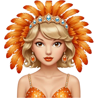 Taylor Swift wearing a vintage showgirl outfit with orange sparkles and feathers and a headdress emoji