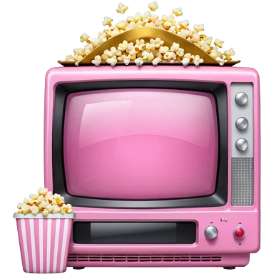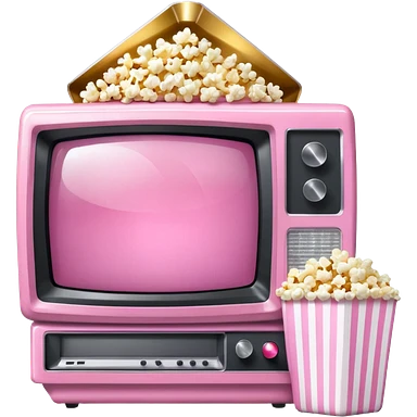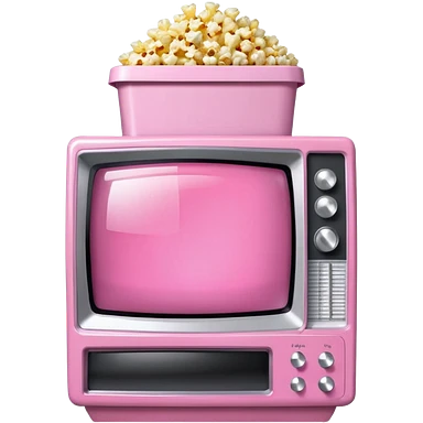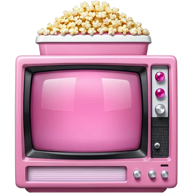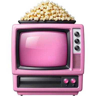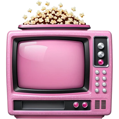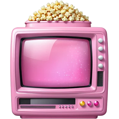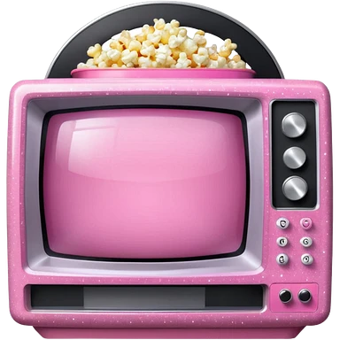 front view of transparent sparkly pink shiny CRT TV sitting on top of pink VCR, with pink/white rhinestone bucket of popcorn beside it emoji