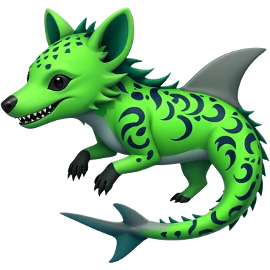 Edgy cool badass Neon-green landhai-sergal-dingo-hyena, with a shark tail, with black and dark-green swirly patterns markings emoji