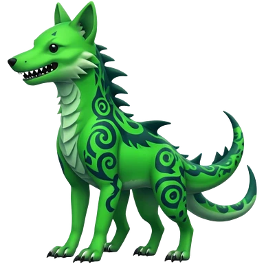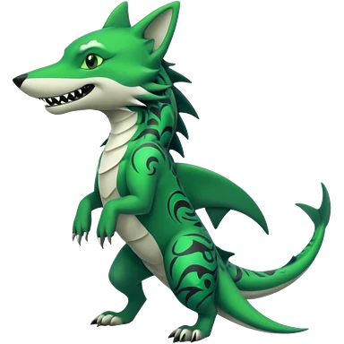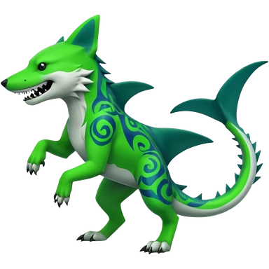 Edgy cool badass Neon-green landhai-sergal-dingo-hyena-wolf-raptor, with a shark tail, with black and dark-green swirly patterns markings emoji