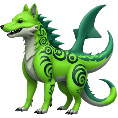 Edgy cool badass Neon-green landhai-sergal-wolf-canine, with a shark tail, with black and dark-green swirly patterns markings emoji