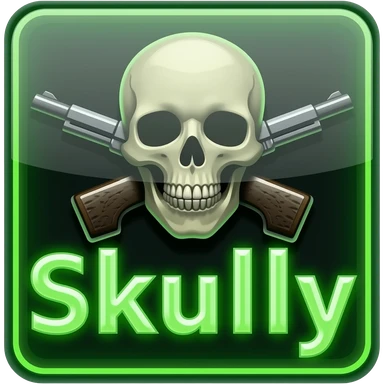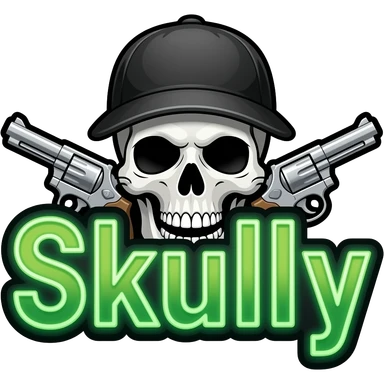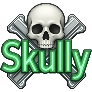 Create me a neon sign that says "Skully" in green with a skull and cross pistols behind it emoji