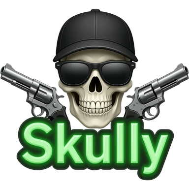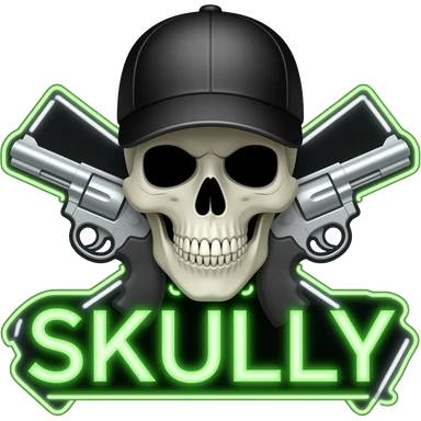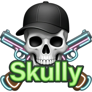 Create me a neon sign that says "Skully" in green with a skull and cross pistols behind it, (the skull and pistols are neon white, grey, and assorted colors) the skull also has black shades and a baseball cap thats black emoji