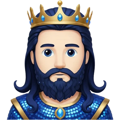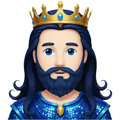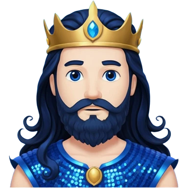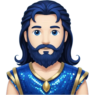 Neptune, King of the Sea from Gods and Goddesses with long black hair and beard, cobalt blue sequin outfit emoji