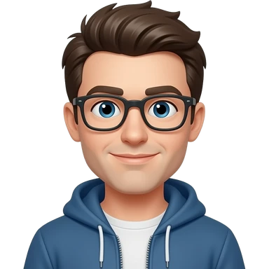 a shy boy wearing thick black glasses (nerd) and hide all his hair under a blue cap, wearing a normal hoodie (ios memoji) emoji
