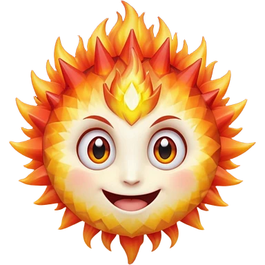 spiky mineral rock characterA single spiky crystal rock character, compact and round with many chunky flame-like spikes, glowing red–orange–yellow gradient like fire, faceted crystal texture, cute face with big shiny eyes and excited smile, emoji