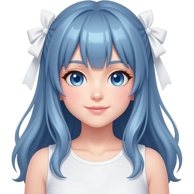 Neuro-sama, AI Vtuber, light-brown hair, blue big round eyes, anime style, pink bow ties in hair, blushing, cute, cyan bow tie on neck, beige-yellow sweater, pig tails, white heart hair clip emoji | AI Emoji Generator
