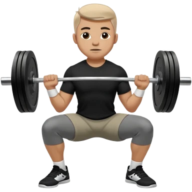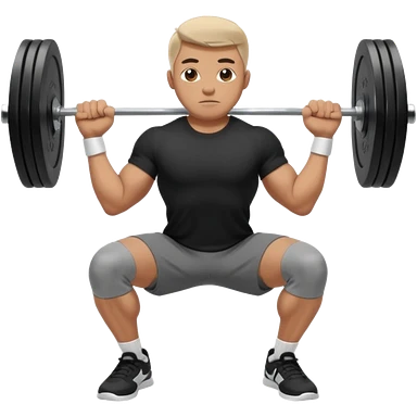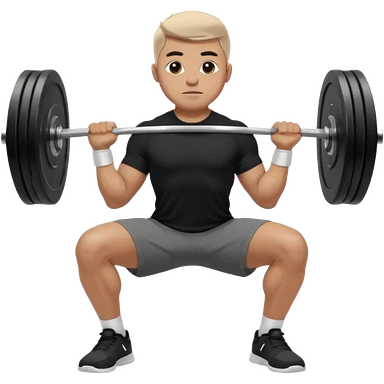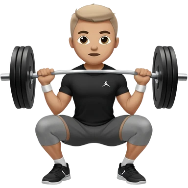 Hombre vestido con playera negra, pants gris y tenis blancos tipo jordan haciendo sentadilla libre con barra con un disco de 20 kilos por lado emoji