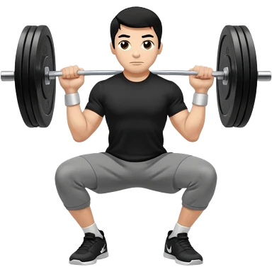 Hombre de cabello negro, tez moreno claro, vestido con playera negra, pants gris y tenis blancos tipo jordan haciendo sentadilla libre con barra con un disco de 20 kilos por lado visto de perfil emoji