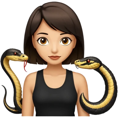 Femme brune yeux marron avec une coupe carré noir , femme couleur de peau typé, avec un cobra a côté , débardeur noir emoji