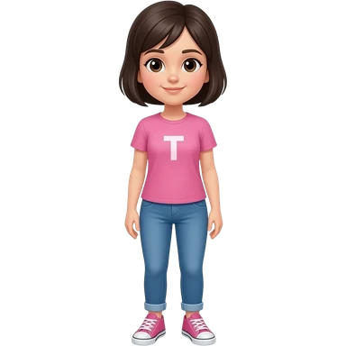chica con ropa camiseta rosa, jeans azul, tenis rosa, de cabello oscuro y corto emoji