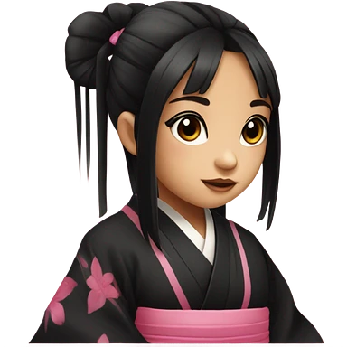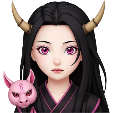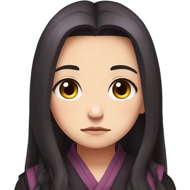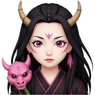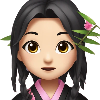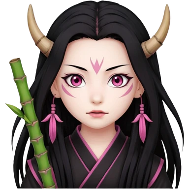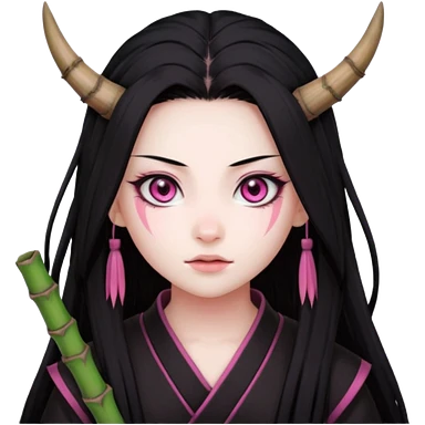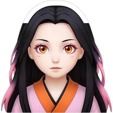 Nezuko with long black hair with orange tips, pink eyes, bamboo muzzle in mouth emoji