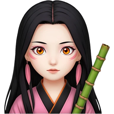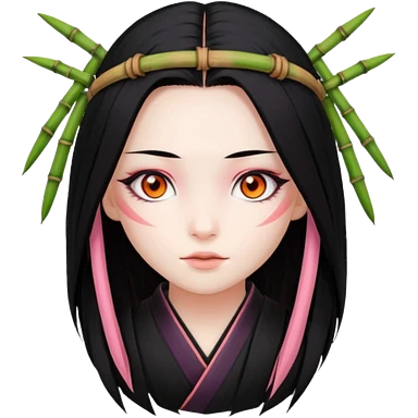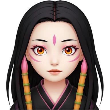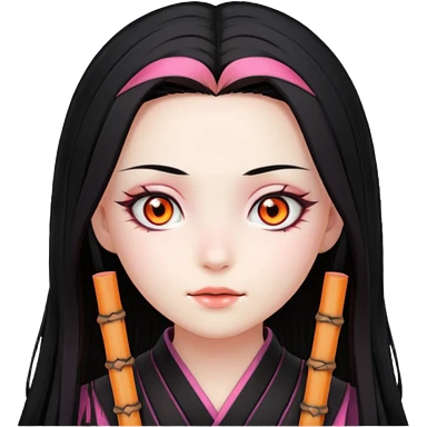 Nezuko with long black hair with orange tips, pink eyes, bamboo muzzle in mouth emoji | AI Emoji Generator