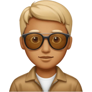 nam 20 tuổi, da vàng, tóc ngắn màu nâu, đội mũ màu đỏ, đeo kính màu đen, đeo khuyên tai màu vàng khoác áo da màu đỏ, nụ cười nhếch mép emoji