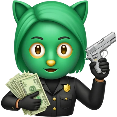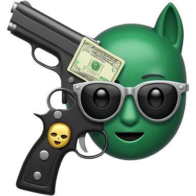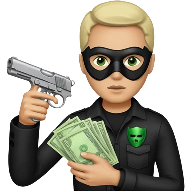 Un emoji con una mascara negra con una pistola pequeña en la mano y que en la otra mano tenga una paca de billetes emoji