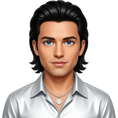 Kevin Richardson from Backstreet Boys with blue eyes, long black 90s slick back hair, white metallic shirt, white necklace emoji