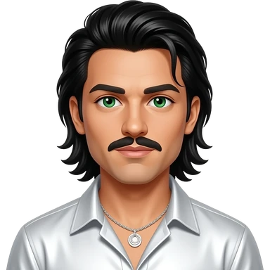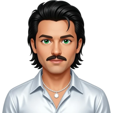 Kevin Richardson from Backstreet Boys with green eyes, long black 90s slick back hair and mustache, white metallic shirt, white necklace emoji